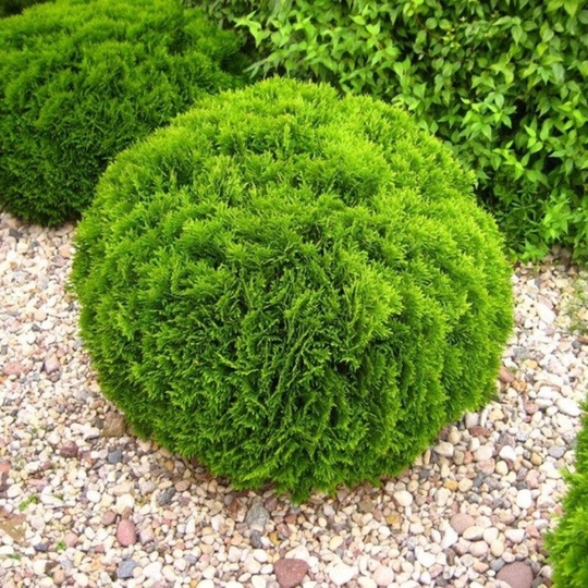 Если нужно украсить пространство красивыми небольшими зелеными шарами, то лучший выбор в этом случае - туя "Даника". Это кустарник шарообразной формы насыщенного зеленого цвета растет очень медленно, 5-6 см в год, и во взрослом состоянии не превышает 0,8 м в высоту и 1 м в ширину. Не требует особого ухода, постоянного полива и выдерживает без укрытия морозы до -40 градусов, но может повреждаться, если на него скидывать снег.