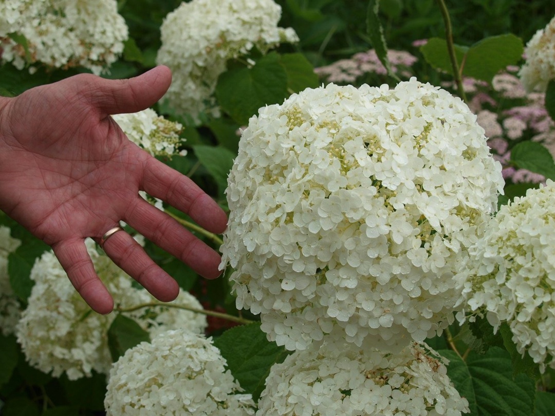 Любимица садоводов и дизайнеров, красавица с огромными белыми шапками соцветий, которые радуют всю вторую половину лета (и даже зиму, если их не срезать). Именно она — одна из первых среди гортензий, кто начинает сезон цветения: вся покрыта пышными белыми соцветиями, как облако в саду. Растёт быстро, в высоту достигает около 1,6 м, в ширину может разрастись и до 3 м. Листья сохраняют насыщенный зеленый цвет до глубокой осени. Не требует особого ухода, разве что любит воду, как и все другие гортензии. Считается, что предпочитает полутень, но у меня одна из них растёт на полном солнце и прекрасно себя чувствует.