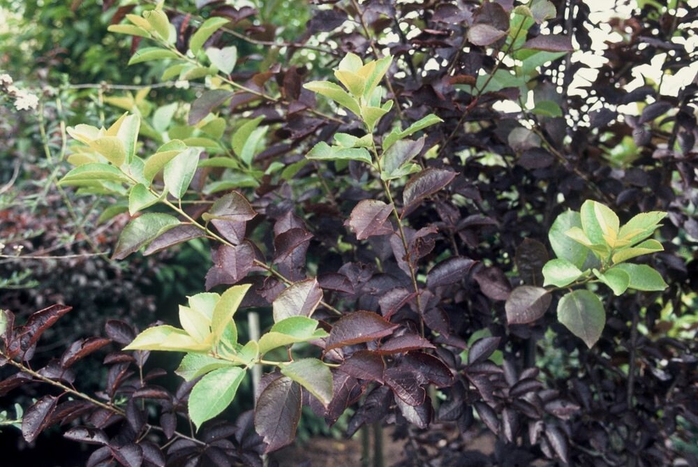 Декоративное быстрорастущее невысокое деревце 3-5 м. Ценится за необычную окраску: листья при распускании и во время цветения зеленые, а затем принимают бордовую окраску. Причем если дерево держать в стрижке, то новые приросты будут зелеными, что создает эффектный вид в композиции.