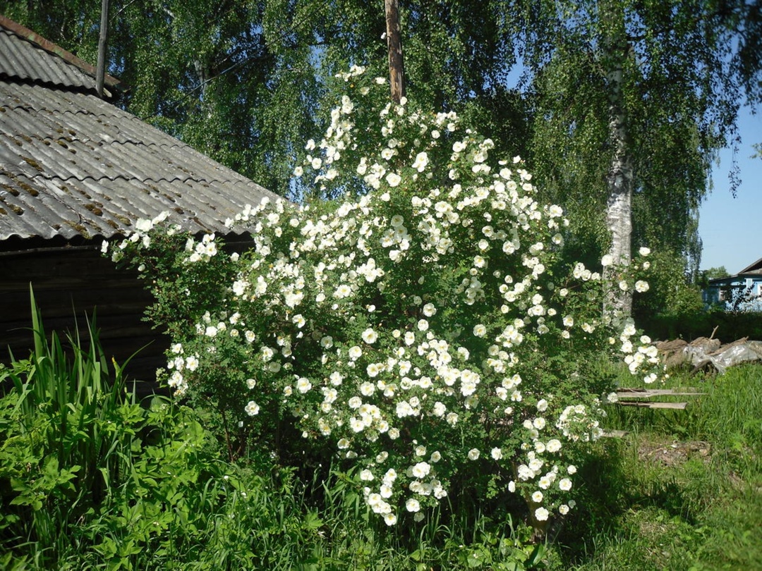 Очень и очень ценю эту розочку, которая на самом деле шиповник. Высота у около 2м. Прелестные мелкие листочки, которые осенью окрасятся в красный, а главное - ветви, усыпанные белыми розами две недели в начале лета. Есть и недостаток - колючейшая она называется не просто так) Плюс стреляет отводками довольно далеко, поэтому нужно продумывать место посадки, где всё это будет уместно. Например, в изгороди, как у нас.