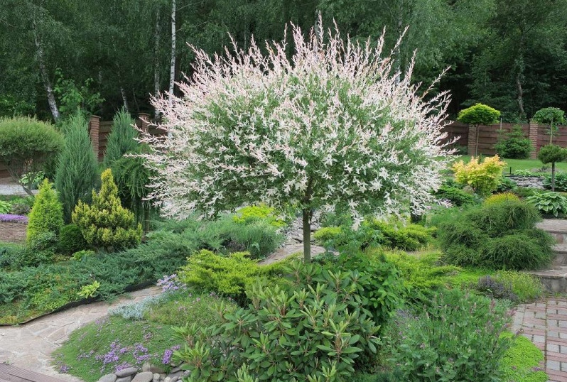 Кустарник до 1,5 м высотой с раскидистой кроной. Молодые листья окрашены в розовый, так что весной кажется, будто ива цветёт! Позже листочки становятся бело-зелёными. Можно стричь в шар или сформировать штамб. Как все ивы, любит влагу, а к почве непривередлива. Сорт устойчив к болезням и вредителям. В сильные морозы побеги могут подмёрзнуть, но куст всегда восстанавливается и очень быстро отрастает.
