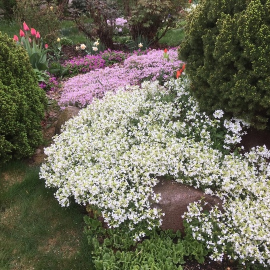 Одно из самых популярных растений для каменистых горок. Плотная цветущая подушечка, которая будет радовать вторую половину апреля. Похожа на более поздно зацветающий флокс шиловидный, но в отличие от него, прекрасно чувствует себя в полутени и из зимы сразу же выходит аккуратным. Разрастается быстро, ничем не болеет и не поражается вредителями.