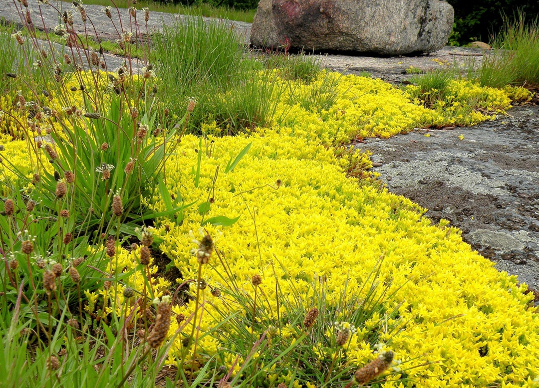 Хотите зелёный коврик, который в один прекрасный момент весь перекрасится в жёлтый? Седум едкий вовсе и не едкий, если вам не вздумается откусить от него кусочек) Быстро разрастается, создаёт плотные красивые куртины до 10 см высотой, неприхотлив и вынослив. Цветет в июне-июле, может рассеиваться по участку, что лично мне доставляет только радость. Подходит для озеленения сложных участков, в том числе зелёных крыш.