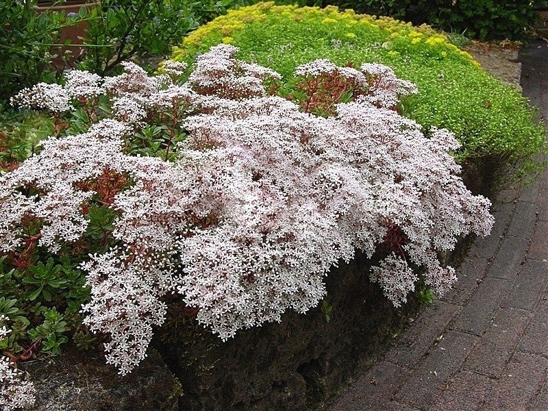 Прелестный быстрорастущий почвопокровник, способный выживать на самой сухой и неплодородной почве. Красиво свисает с подпорных стенок и камней, отлично себя чувствует в кашпо. Высотой до 10 см. Цветет в середине лета восхитительным бело-розовым облаком. Самая насыщенная окраска будет на полном солнце.