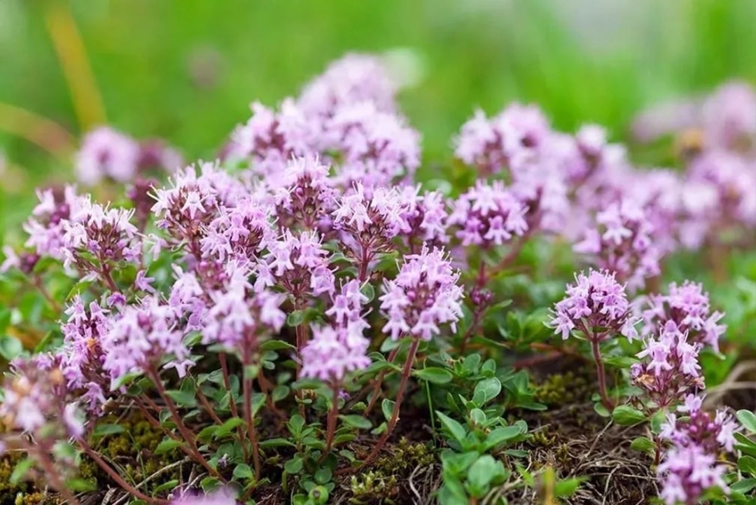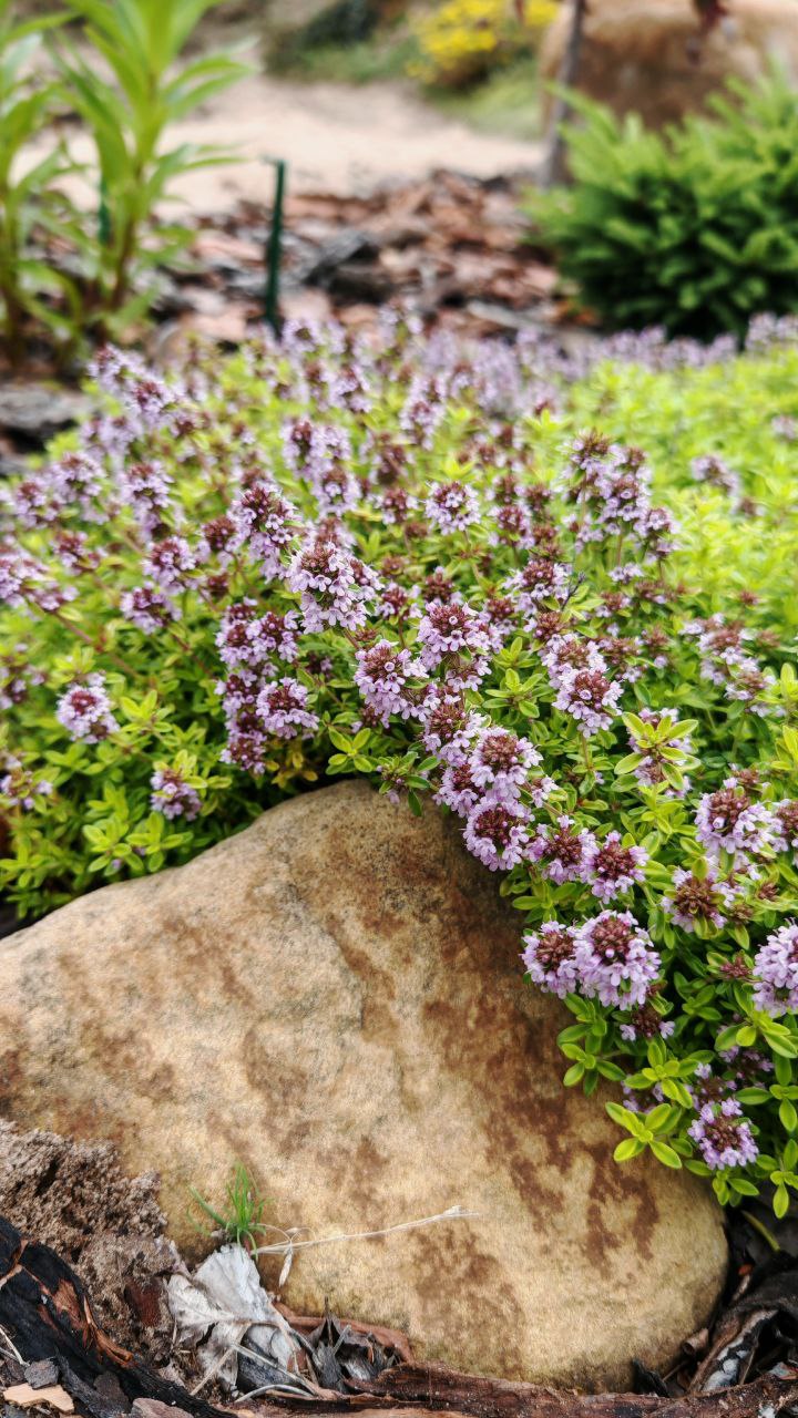 Настоящее украшение участка - плотная подушечка с немного золотистой листвой и сиреневыми цветками. На самом деле это низкорослый кустарничек - не больше 15 см в высоту, цветет июнь-июль. Можно использовать и как приправу, и в чай, а я жалею срезать такую красоту, потому ращу как декоративное растение)